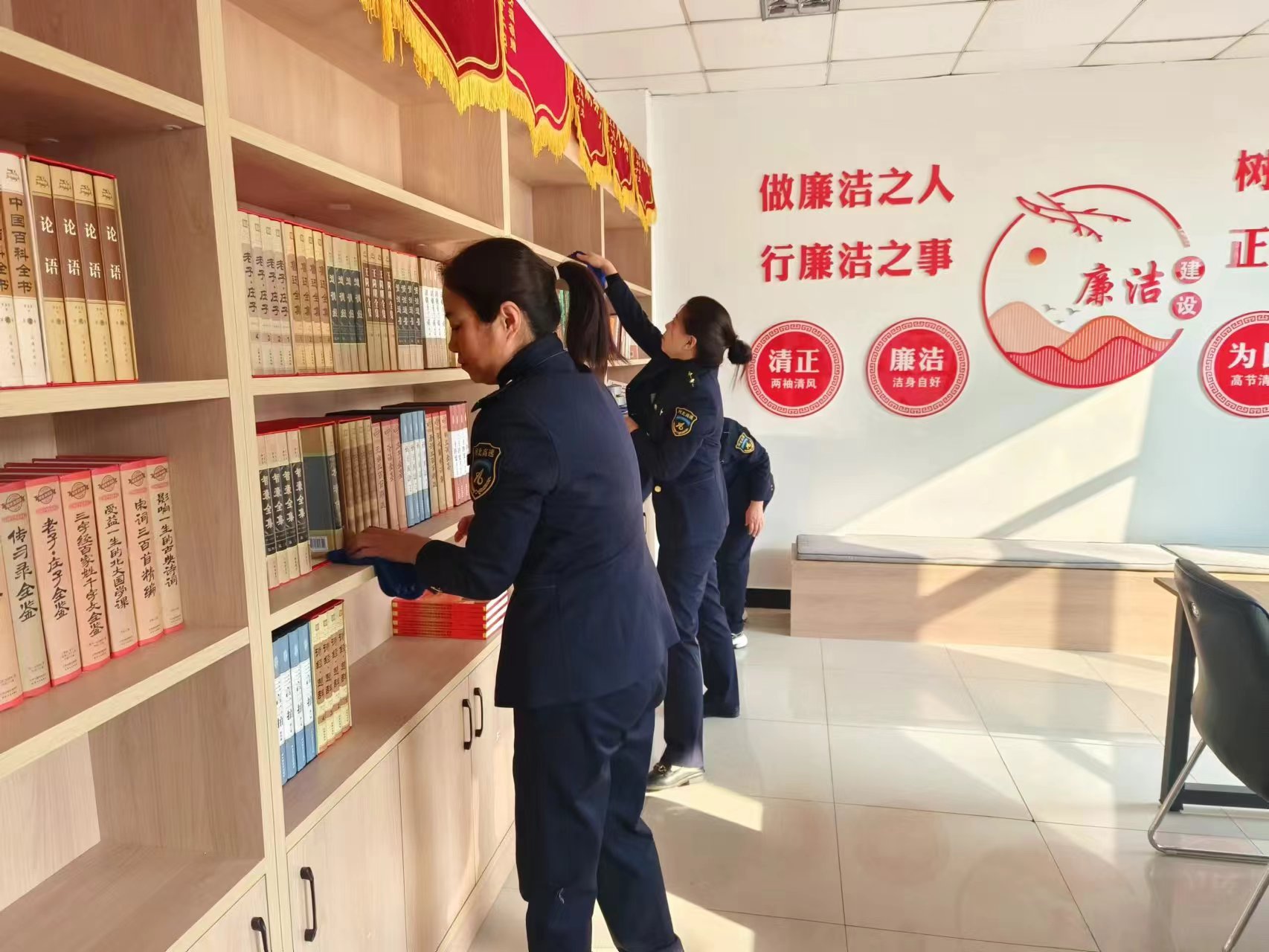 活动中,大家秉持“突出重点,不落细节”的原则,分工明确、干劲十足,首先组织职工集中对收费车道、广场、边沟等区域的垃圾杂物进行了全面捡拾,对收费岗亭、机电设备进行整体擦拭,使站容站貌得到很大的改善;随后对宿舍及办公公共区域图书室、会议室、等进行认真清理,办公物品等摆放整齐有序;最后对发电机房、地源热泵房等“重地”进行专项清理,使用专用清洗工具对顽固污渍进行深入清理,严防卫生死角。