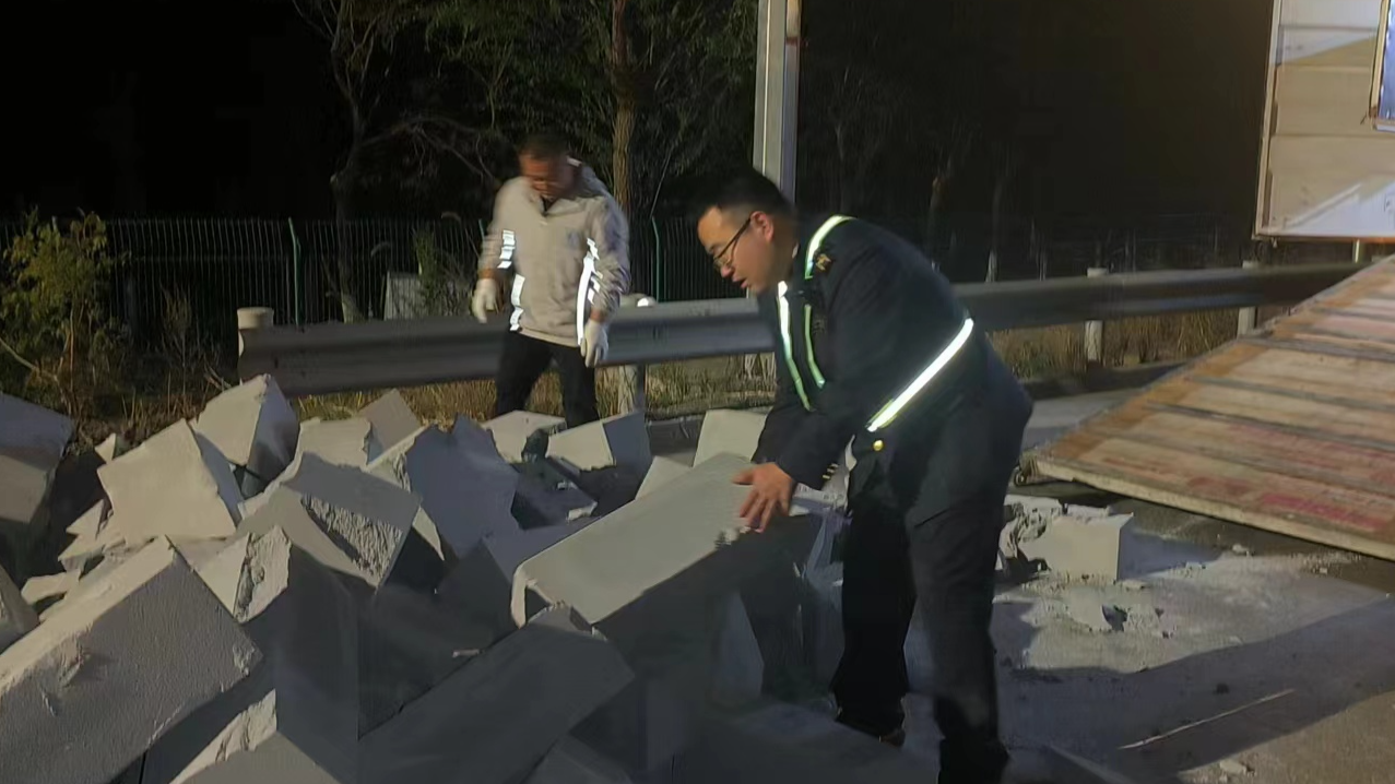 2024年4月15日21时许,一辆运输泡沫砖的六轴货车驶入三河南收费站,装载的泡沫砖在过地泵时大量散落,司机尚未发觉仍正常驶向收费站入口。