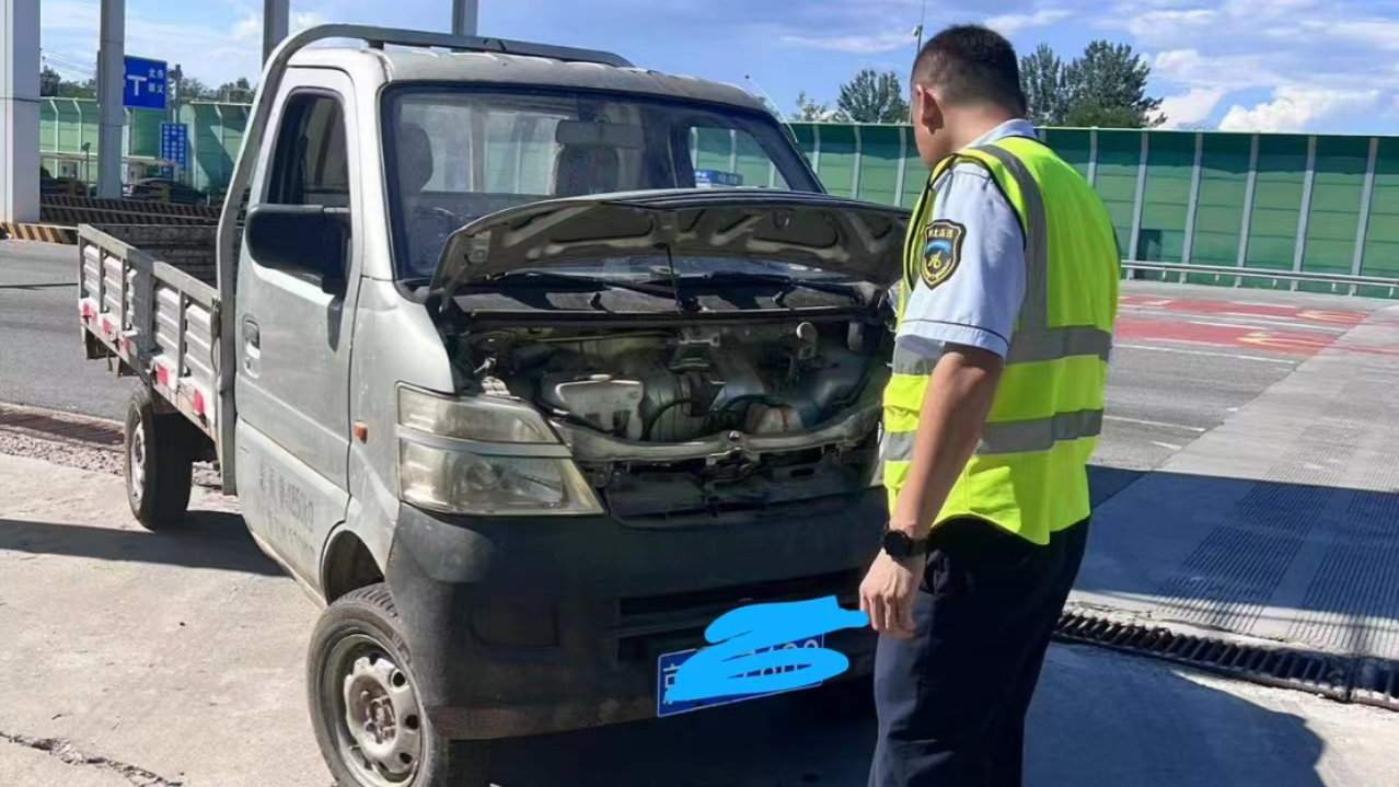 10月7日中午,正值国庆假期返程高峰,一辆二轴货车冒着“白烟”疾驰驶入收费广场,停留在燕郊西收费站大门口。