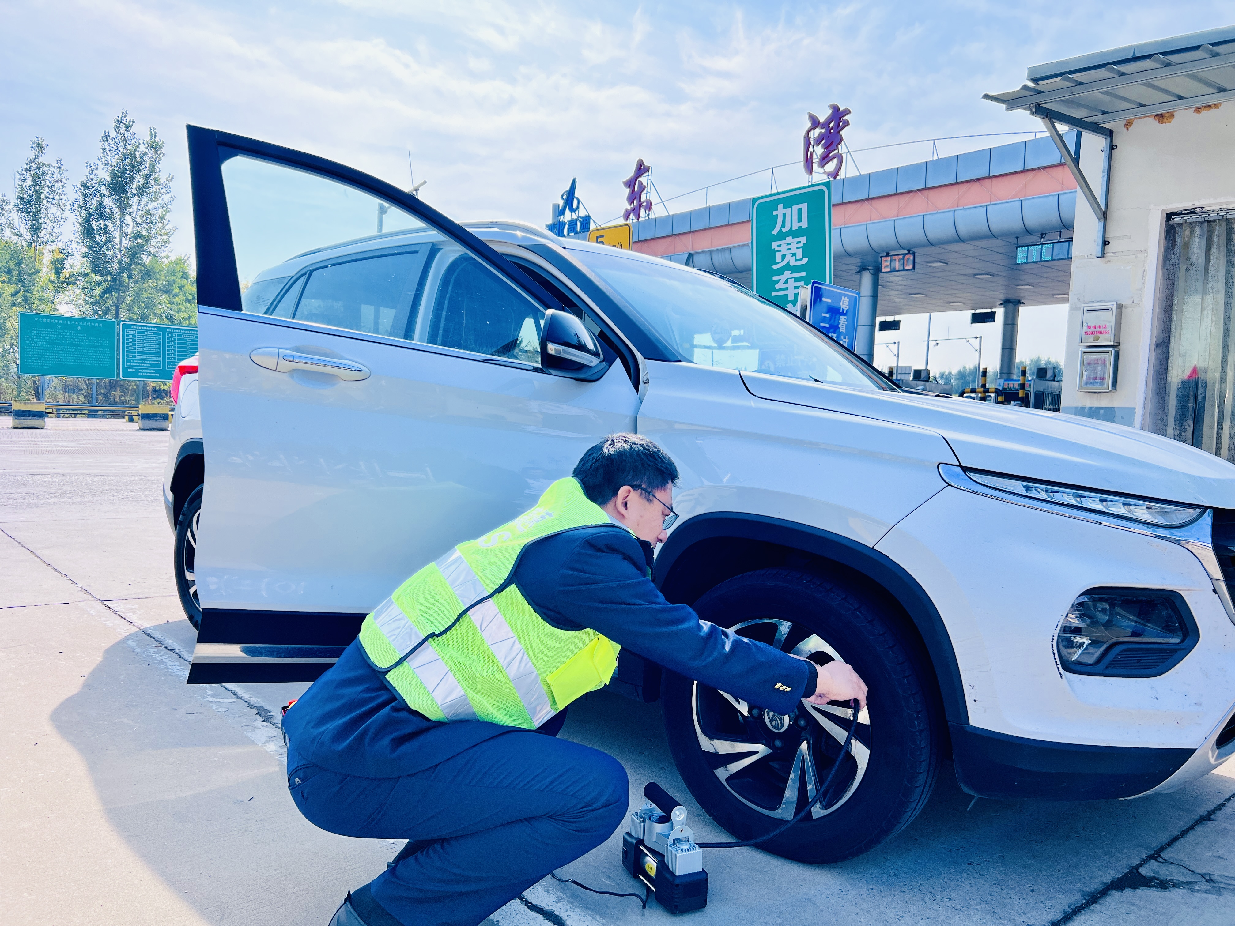 班长将车辆引导至收费外广场安全区域,经过仔细查看原来是轮胎被钉子扎了小洞,轮胎正缓慢亏气,班长从便民服务亭拿来自动充气泵帮司机充好气,对司机说:“前边不远就是修补轮胎的地方,你赶紧去吧,注意安全!”司机对工作人员的及时帮助表示非常感谢并说道:“谢谢你,真的太感谢你们了。”