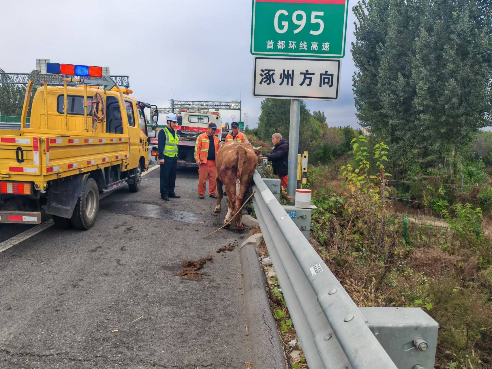 6时25分,接监控室电话,据路过司机反映,在涿州方向距离万庄停车区五公里附近发现一头牛在高速公路上徘徊,情况十分危险。接到报告后,值班人员立即将情况汇报给了马玉志队长,并第一时间通知了救援公司。