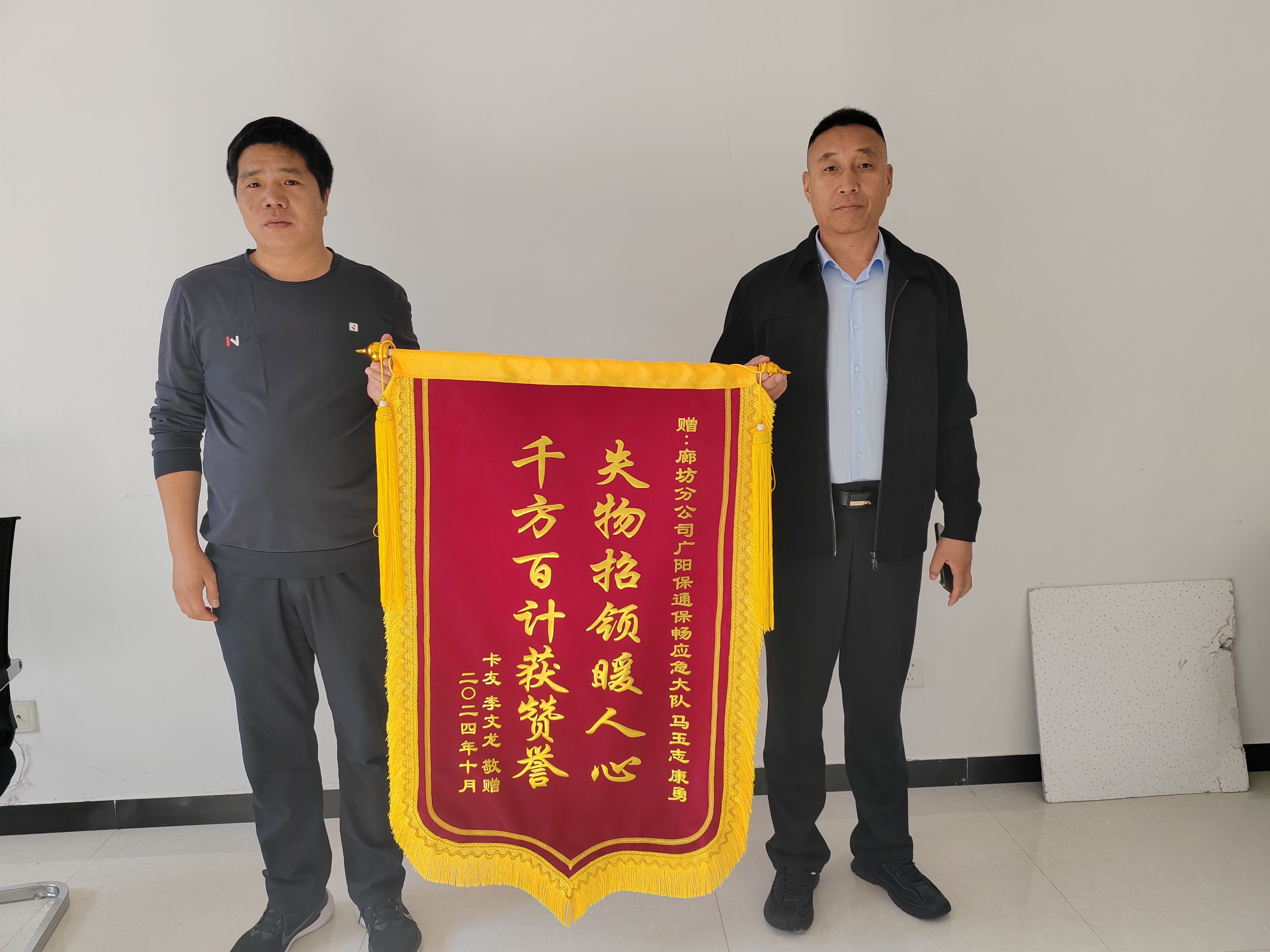 经过近一个小时的紧张处理,7时40分,现场情况得到了有效控制。为了确保牛能够顺利回到主人身边,广阳保通保畅应急大队队长马玉志同志第一时间联系相关部门,查找到了失主,在大广高速任丘服务区将牛交还给焦急等待的主人。当看到自家的牛只安然无恙地被找回时,那位主人激动得热泪盈眶,连声道谢。之后,为了表示感谢,为广阳保通保畅应急大队制作了锦旗,其中特别鸣谢了马玉志同志与康永同志。