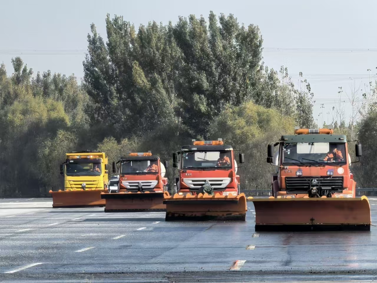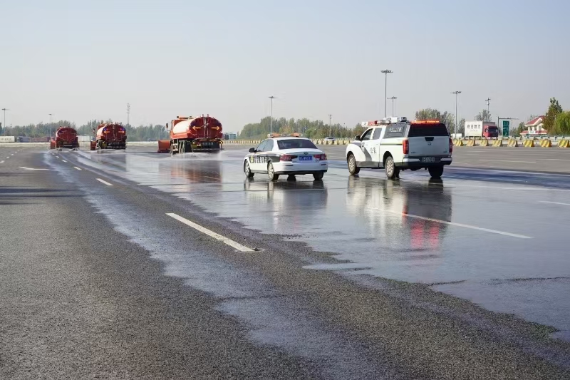 本次演练以实战为主,以实用为先,通过实际操作检验设备运行状况和各单位协同能力,为除雪保畅工作夯实基础。参演车辆包括固态撒布车1辆、液态洒布车3辆、除雪铲4台、预警车辆3辆、救援车1辆。演练模拟沿线路段出现的降雪天气,按照降雪各阶段除雪作业流程,通过液态融雪剂洒布作业、固态融雪剂撒布作业、铲雪车梯队推雪作业,预警车辆预警、压车带道作业,事故车辆救援作业等,相互配合完成除雪演练,检验了除雪预案的科学性、实用性和可操作性,磨合了除雪保畅相关单位、部门和人员的协调联动,锻炼了除雪保畅队伍在恶劣天气时应急处置的能力。