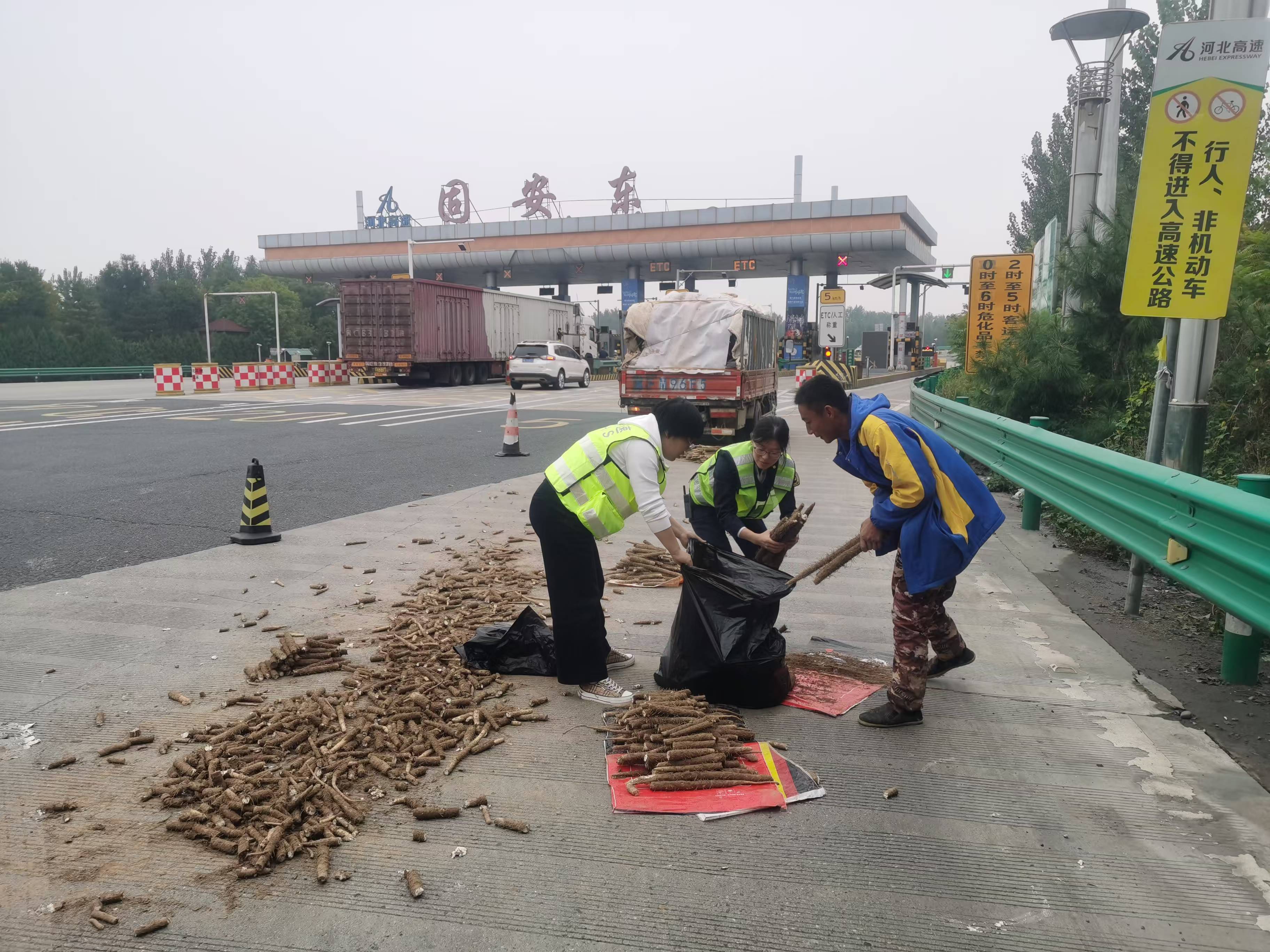11月20日上午10时许,固安东收费站收费班长巡查时,发现收费站外广场有一辆小型货车因捆绑货物的绳索断裂,导致后半车的货物全部散落至外广场上。班长立即指挥该货车靠边停车,疏导其他车辆避让通行,并在车辆双向设置安全警示标志形成一个安全区域。