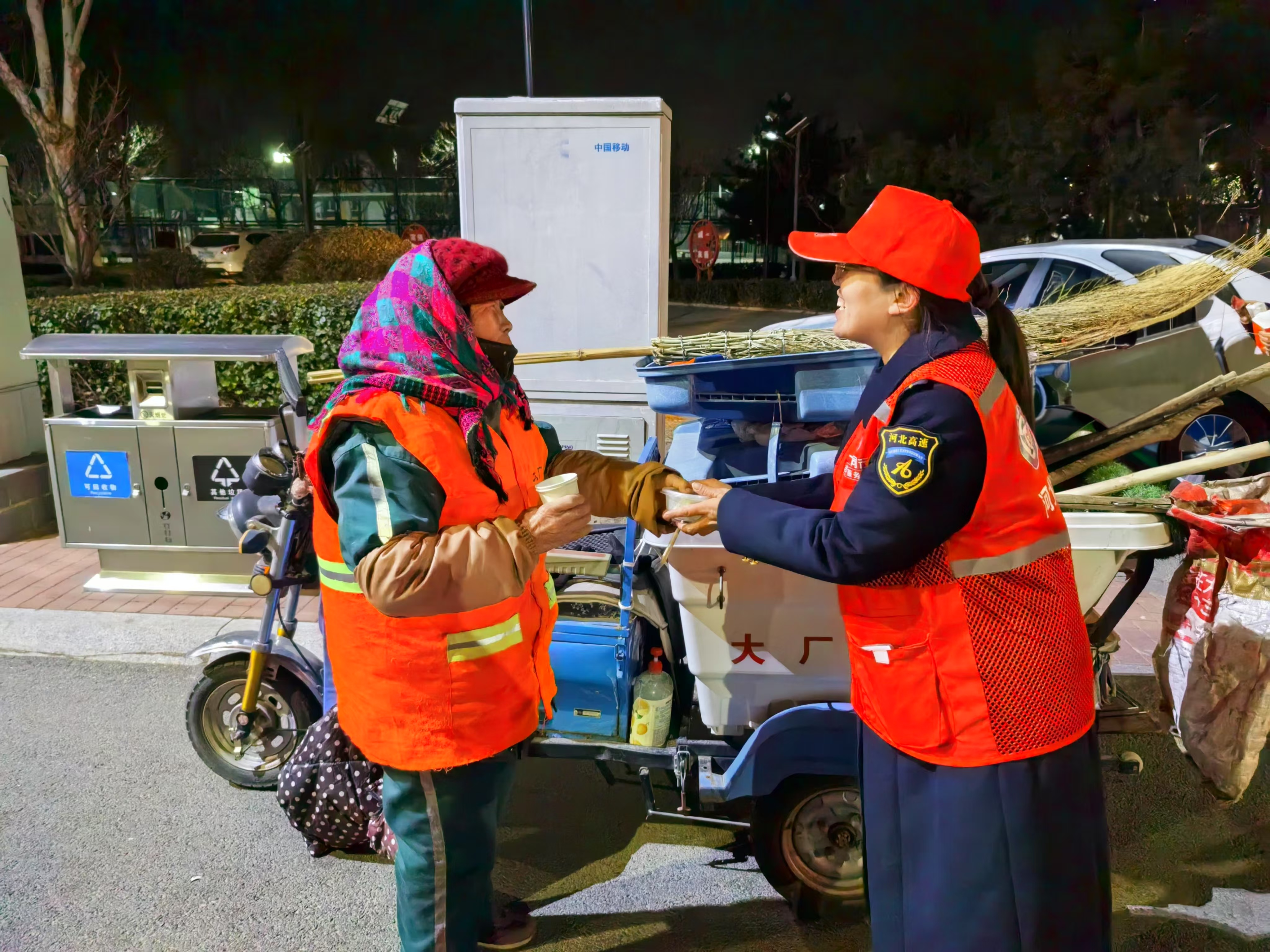 凌晨四点半,志愿者们就开始忙碌起来了,切姜丝,煮姜茶、煮饺子、准备爱心物品……五点半,大厂东小分队的志愿者们满怀着一颗颗火热的爱心已经出发,此时路上还没有什么行人,大厂县城的街道还是冷冷清清的,但一路走来依然能看到各行各业的劳动者冒着寒风忙碌着,有环卫工人、菜农、快递小哥、外卖员、货车司机还有求学的莘莘学子……志愿者们脸上洋溢着温暖而真诚的微笑,为他们送上热气腾腾的饺子、手套和纸巾,并为他们倒上一杯热姜茶,希望能为各行各业的劳动者们驱走一丝冬日的寒冷。一位环卫工人接过热姜茶,喝过一口,脸上露出质朴的笑容:“冬天干活虽然冷,但喝了这杯热姜茶,心里暖烘烘的。”志愿者们听到这句话,心里也暖烘烘的,“赠人玫瑰 手有余香”,也许这就是奉献的幸福吧!