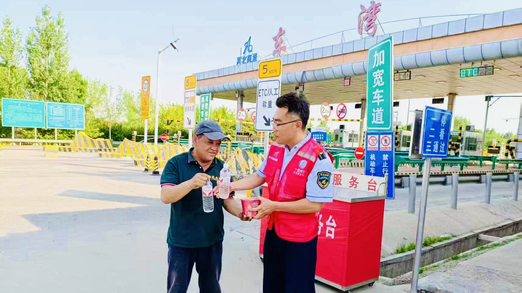 一位来自河南商丘的农机手接过收费站工作人员递过来的水和方便面,激动地说:“天气这么热,我们又赶时间,没想到收费站这么贴心,还准备了这么多东西!虽然高温炙烤,但东湾收费站的服务却让我们感到格外舒适。”东湾收费站为过往农机手们设置了“三夏”服务台,24小时不间断地提供热水、应急药品和便捷食品。许多过往司机都表示,东湾收费站的贴心服务让他们出门在外也感觉像在家里一样。