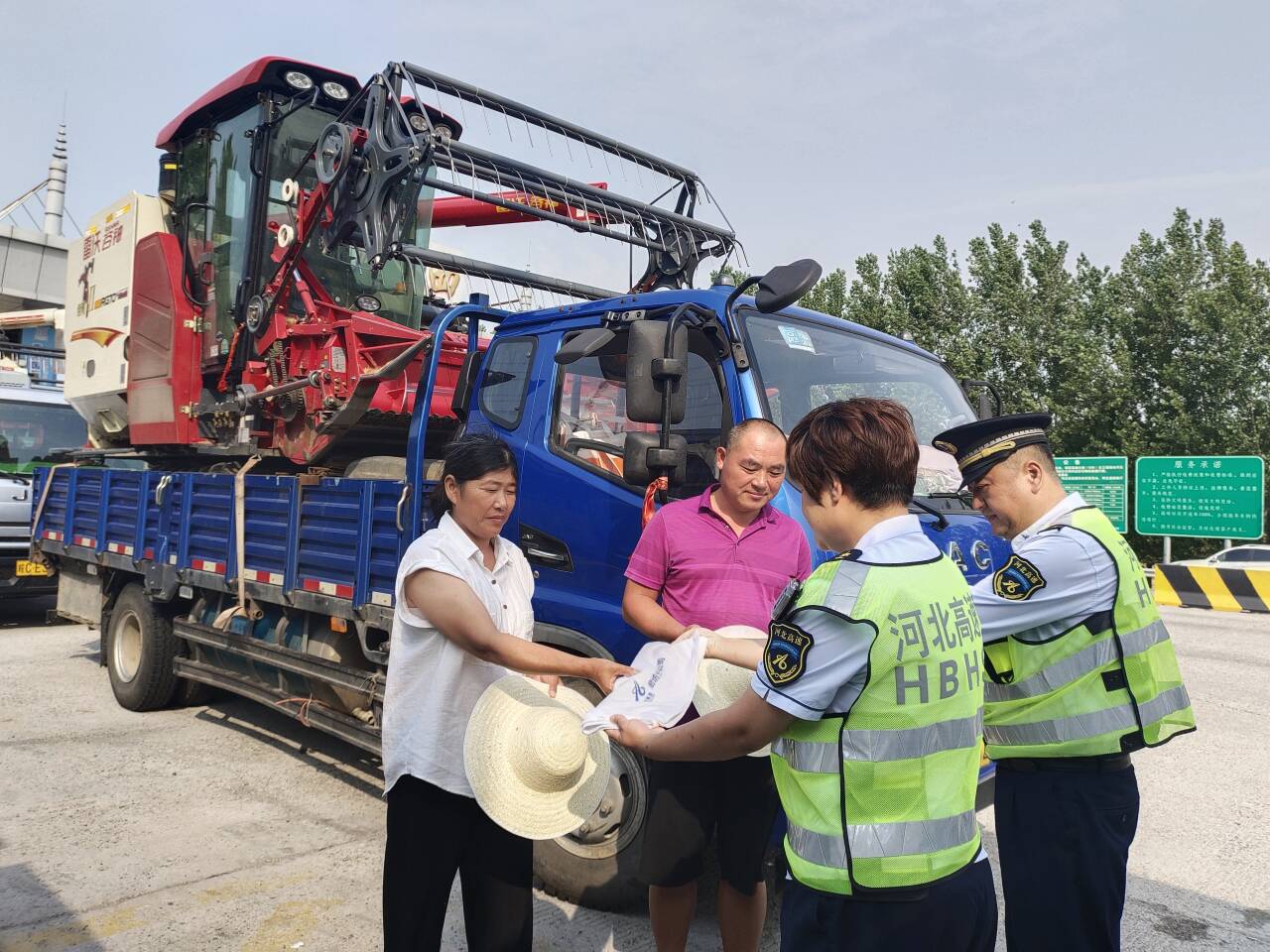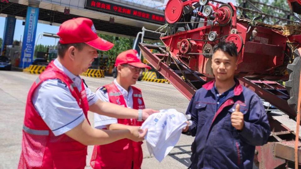 暖心服务驿站,传递关怀与温度。设立“三夏”服务台,为农机手们提供矿泉水、方便面、热水、《联合收割机运输车辆免费通行指南》,还准备了藿香正气水、修车工具、草帽、毛巾、手套等物资。此外,工作人员主动与农机手沟通交流,详细了解他们的需求和困难,为其提供周边路况、加油站、维修点等信息咨询服务,帮助解决实际问题。贴心的服务,让农机手们在奔波途中感受到家一般的温暖。