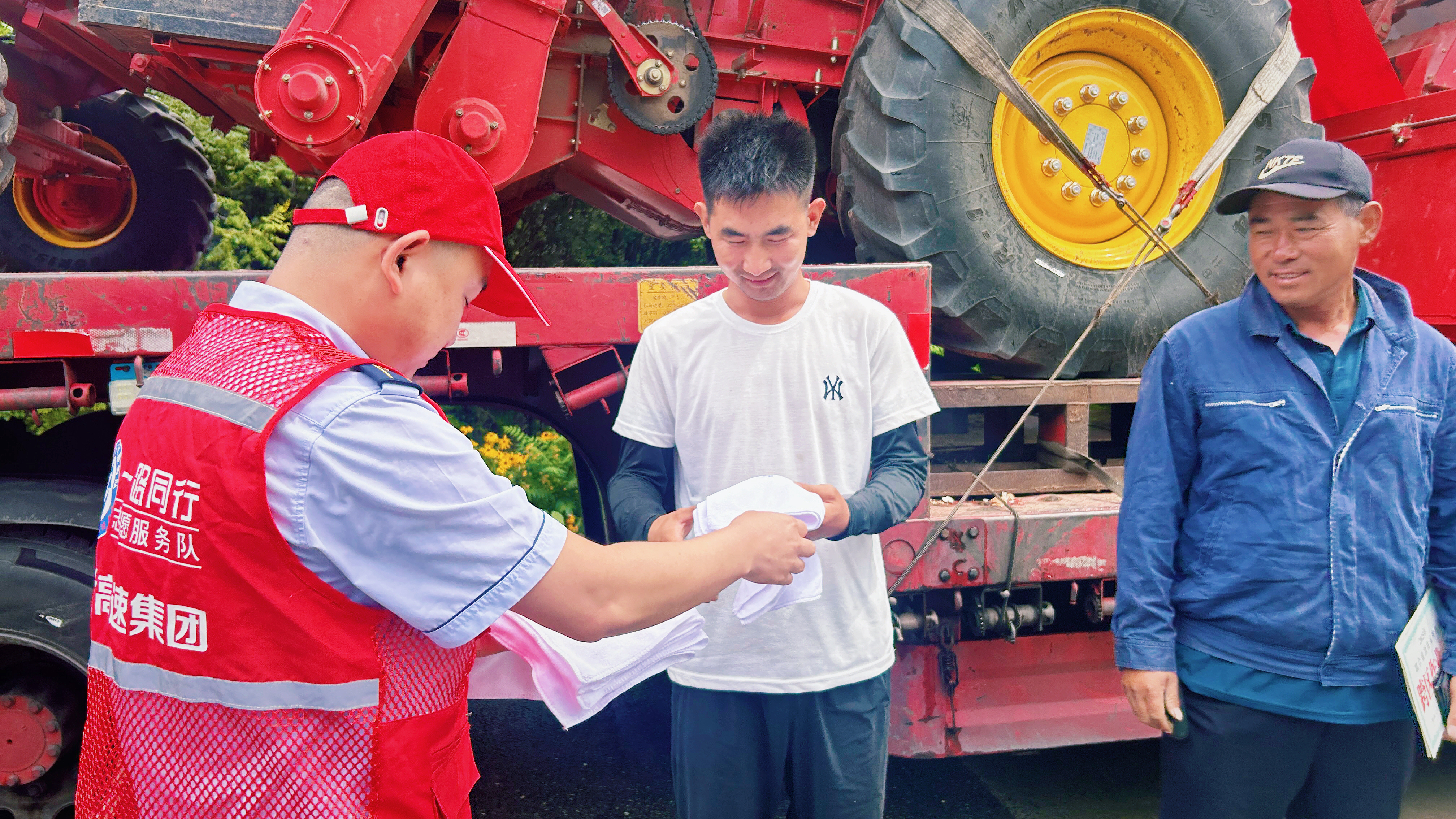 在收费站广场,齐心庄收费站设立了“三夏”便民服务台,由党员和青年志愿者组成服务队伍,为过往的农机手和司乘人员提供饮用水、毛巾、修车工具、手机充电等贴心服务。此外,还为他们提供周边路况咨询、路线指引等服务,帮助农机手规划最佳行驶路线,确保农机顺利抵达作业地点。