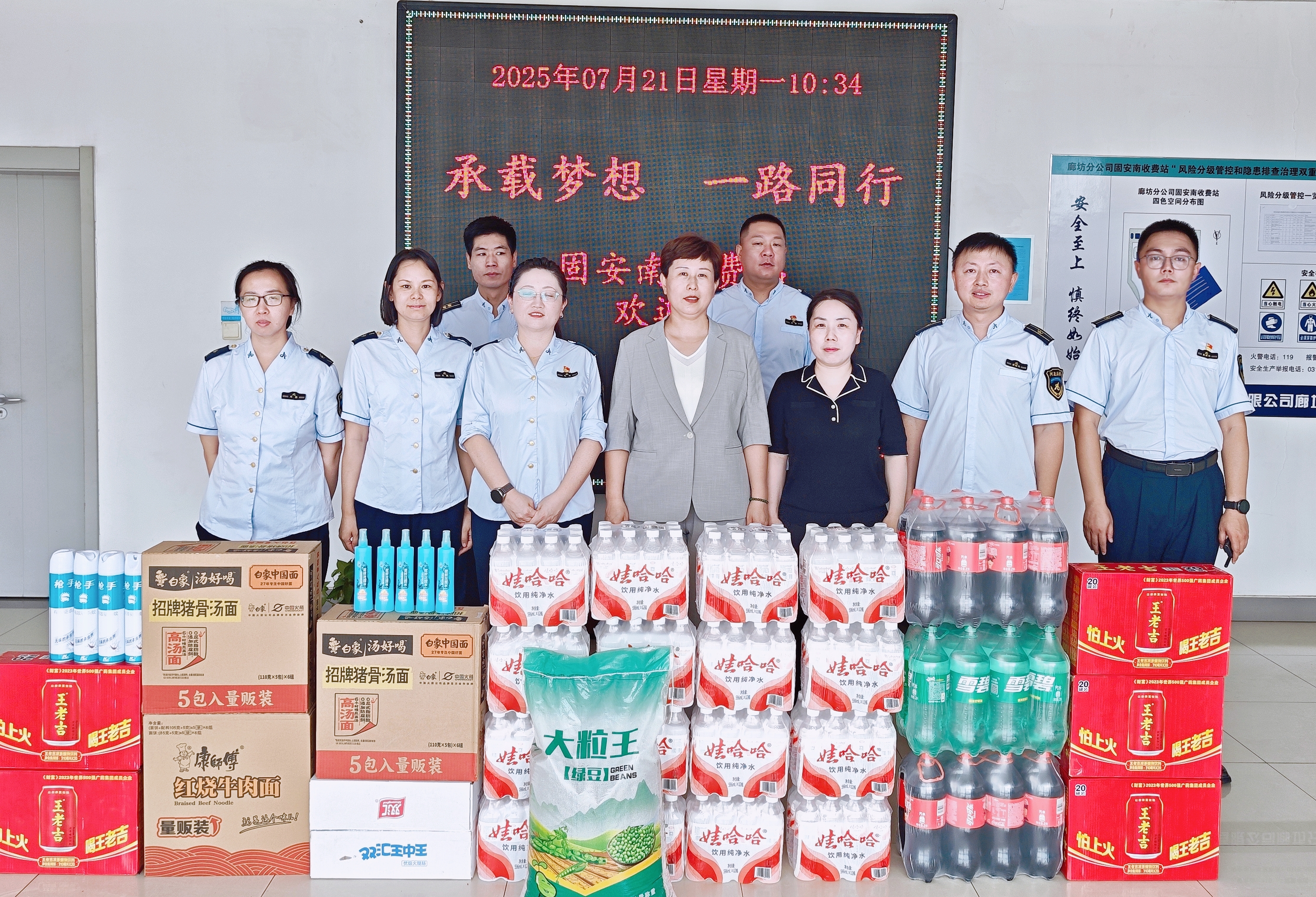 炎炎夏日,暑气蒸腾。7月21日,廊坊分公司副总经理弓春燕一行顶着高温来到固安南收费站,代表分公司领导班子向坚守在一线的收费站员工送上夏日的清凉与关怀,对大家的辛勤付出表示诚挚感谢。