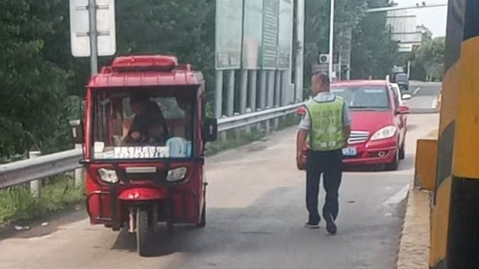 8月10日16时26分,疏导人员在入口处发现一辆电动三轮车正欲跟随其他车辆驶入高速。疏导人员立即上前劝阻,将车辆引导至安全区域,并向车主严肃说明高速公路的行驶规定,同时,结合类似事故案例,向车主详细讲解了违规驶入的危害性。