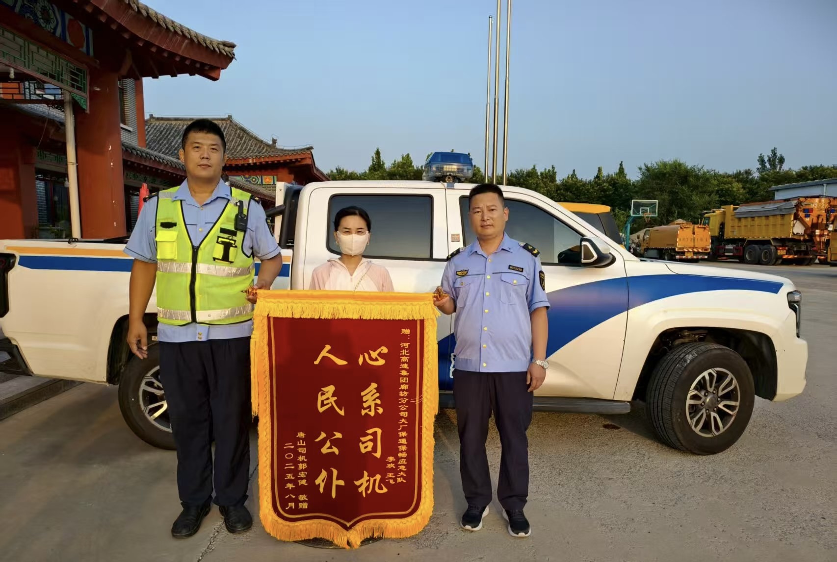 8月11日下午,一面印着“心系司机,人民公仆”感谢话语的锦旗被一位司机郑重地送到队员们手中。锦旗上熠熠生辉的字样,满含着司机对队员们的真挚谢意,这暖心一幕的背后,是一段一周前发生在密涿高速上的紧急救援故事。