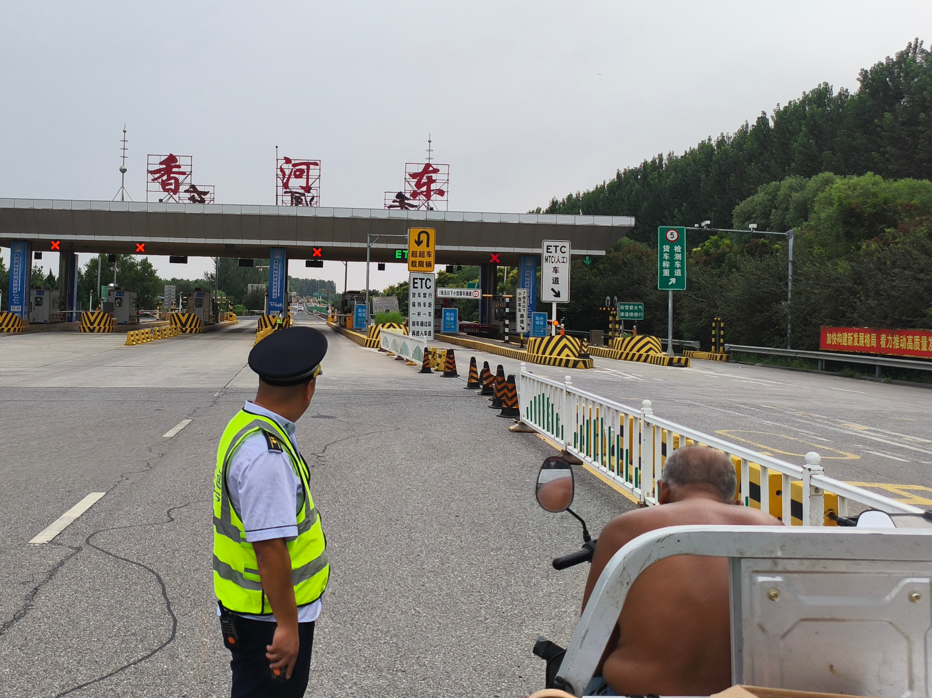 8月26日下午,正值晚高峰前的车流平缓时段,香河东收费站入口处秩序井然,发卡人员发现一名驾驶电动三轮车的老大爷正欲驶入站口,当时入口虽无密集车流,但偶有车辆快速驶入,老大爷的行为不仅违反交通规定,更面临被机动车剐蹭的风险。发卡人员立即通过对讲机紧急通知当班班长刘欢。