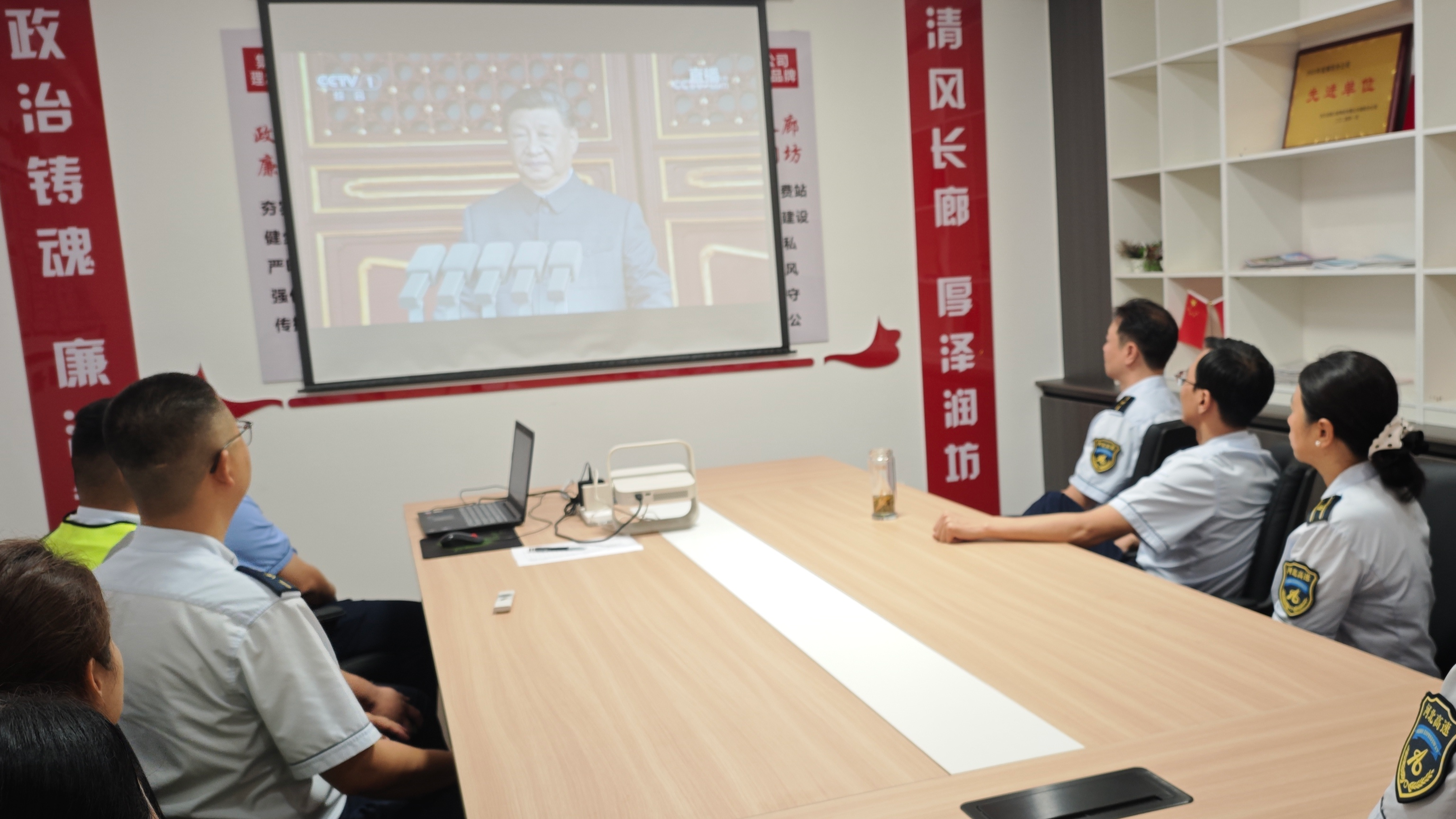 9月3日上午,燕郊西收费站组织在站职工集中观看纪念中国人民抗日战争暨世界反法西斯战争胜利80周年大会。