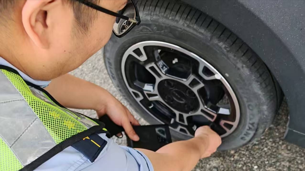 彼时,他刚在入口称重区忙完超限车辆疏导,对讲机里突然传来司乘求助,车辆轮胎气压不足,正急得团团转。没有片刻迟疑,他抓起随车充气工具便快步赶来。蹲下身,稳稳对接气嘴,目光紧紧锁在压力表的指针上,充气、观察、微调,每一个动作都透着经年累月练就的专业与细致。秋日的阳光仍带着灼人的温度,汗水顺着他的额角滑落,浸湿了后背的衬衫,他却全然顾不上擦拭。