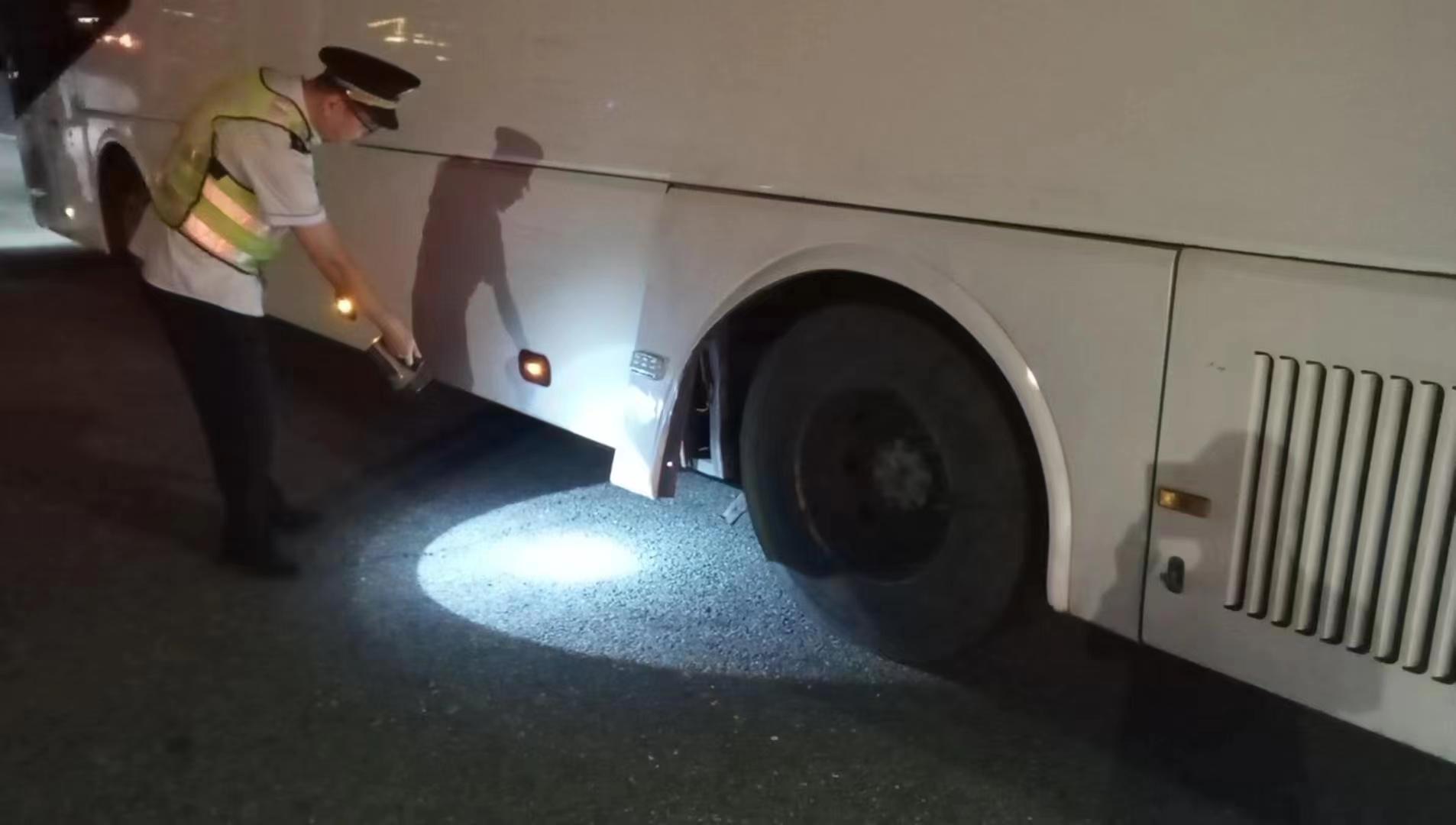 了解情况后,工作人员当即转身跑回岗亭,取来强光手电折返。“您别慌,我给您照照亮!” 他稳稳握住手电,将光束精准对准大巴车后轮及底盘,随着司机的检查节奏缓缓移动轮胎破损处、底盘连接件、周边路况,每一个细节都被照亮得清清楚楚。夜色里,手电光束成了最可靠的 “眼睛”,司机借着光亮仔细排查,很快确认除爆胎外无其他故障,随即安心联系起维修人员。