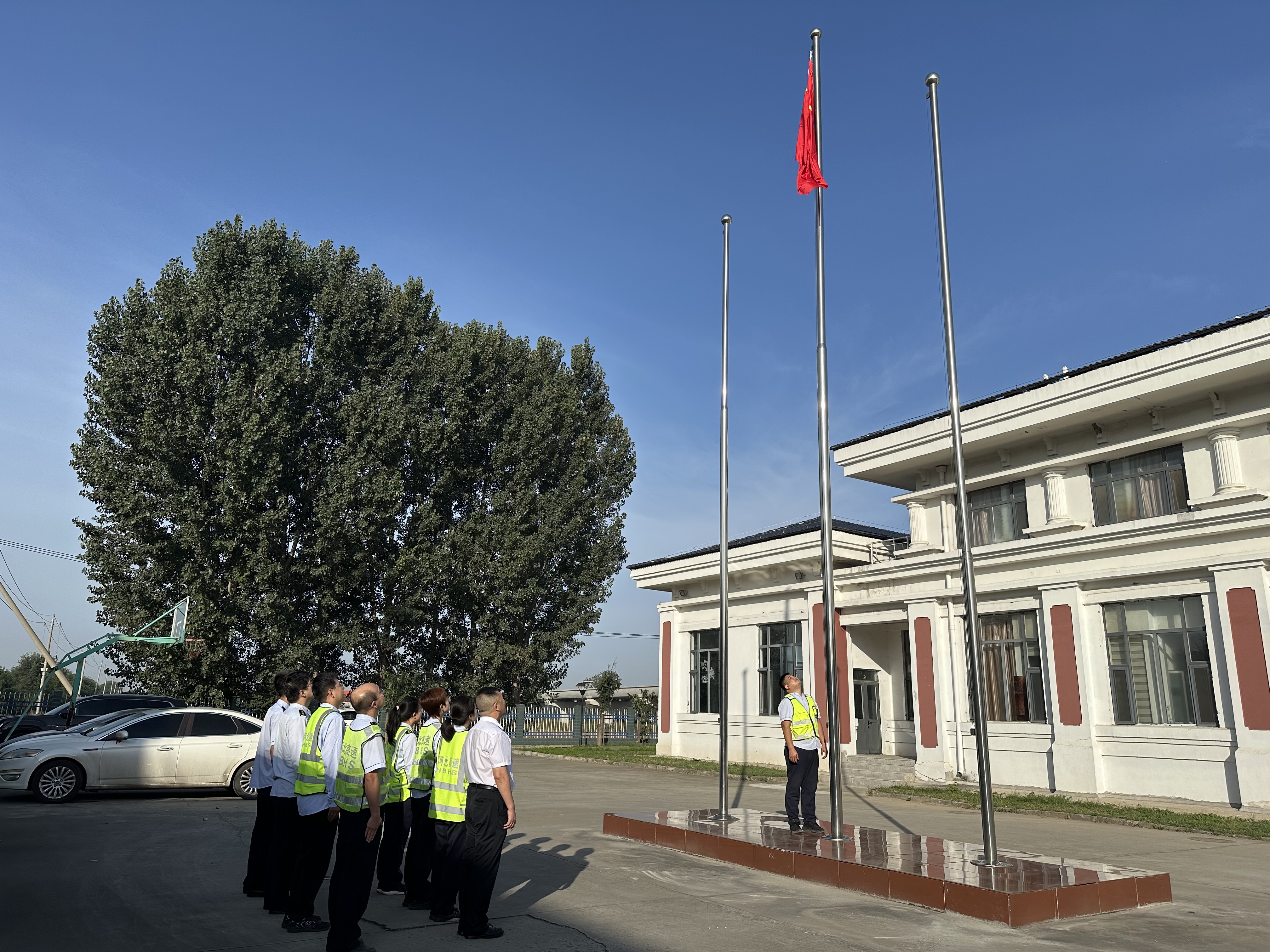迎着朝阳,升旗仪式正式开始。伴随着雄壮激昂的《义勇军进行曲》,鲜艳的五星红旗冉冉升起,全体职工肃立注目,齐声高唱国歌,目光紧紧追随着飘扬的国旗,心中的爱国敬意与民族自豪感油然而生。
