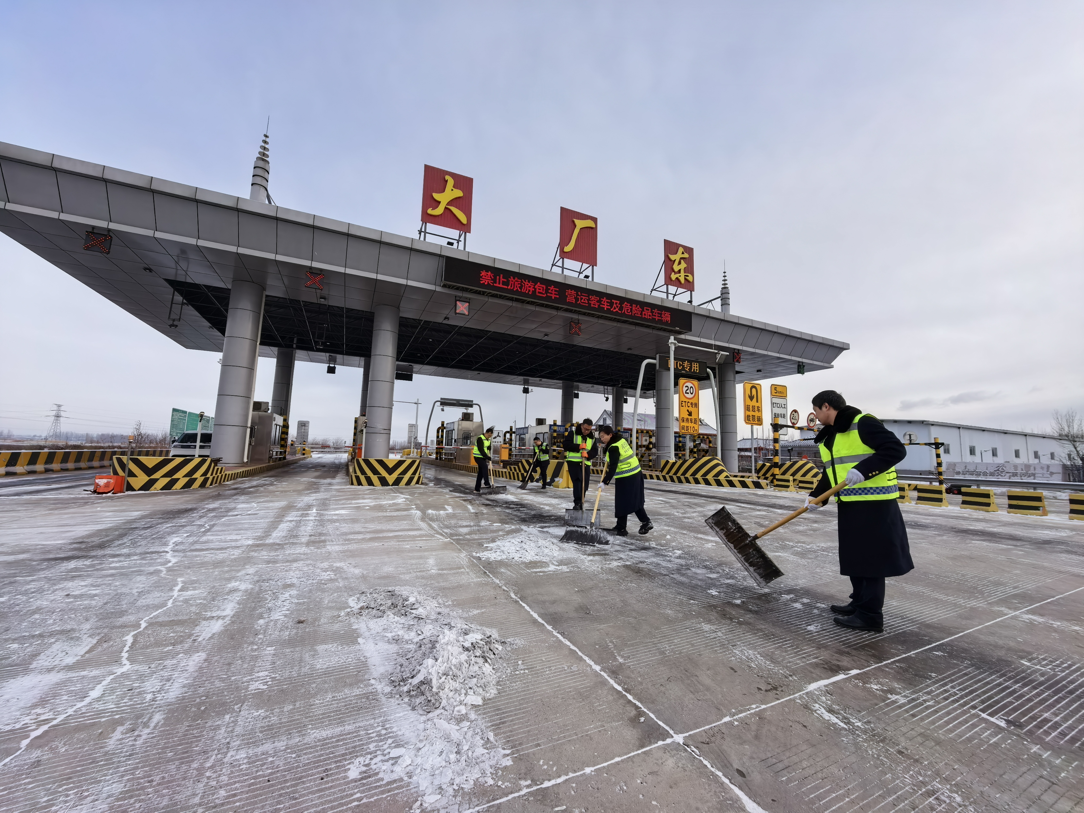 降雪后,大厂东收费站严格落实“随下随清、雪停路净”工作要求,清晨雪停后,党员骨干带头冲锋,对收费车道、广场进行循环清扫,同步预撒融雪剂,有效阻断积雪堆积和结冰隐患,并通过机械破冰与人工铲雪协同发力,分片包干清理边角盲区。