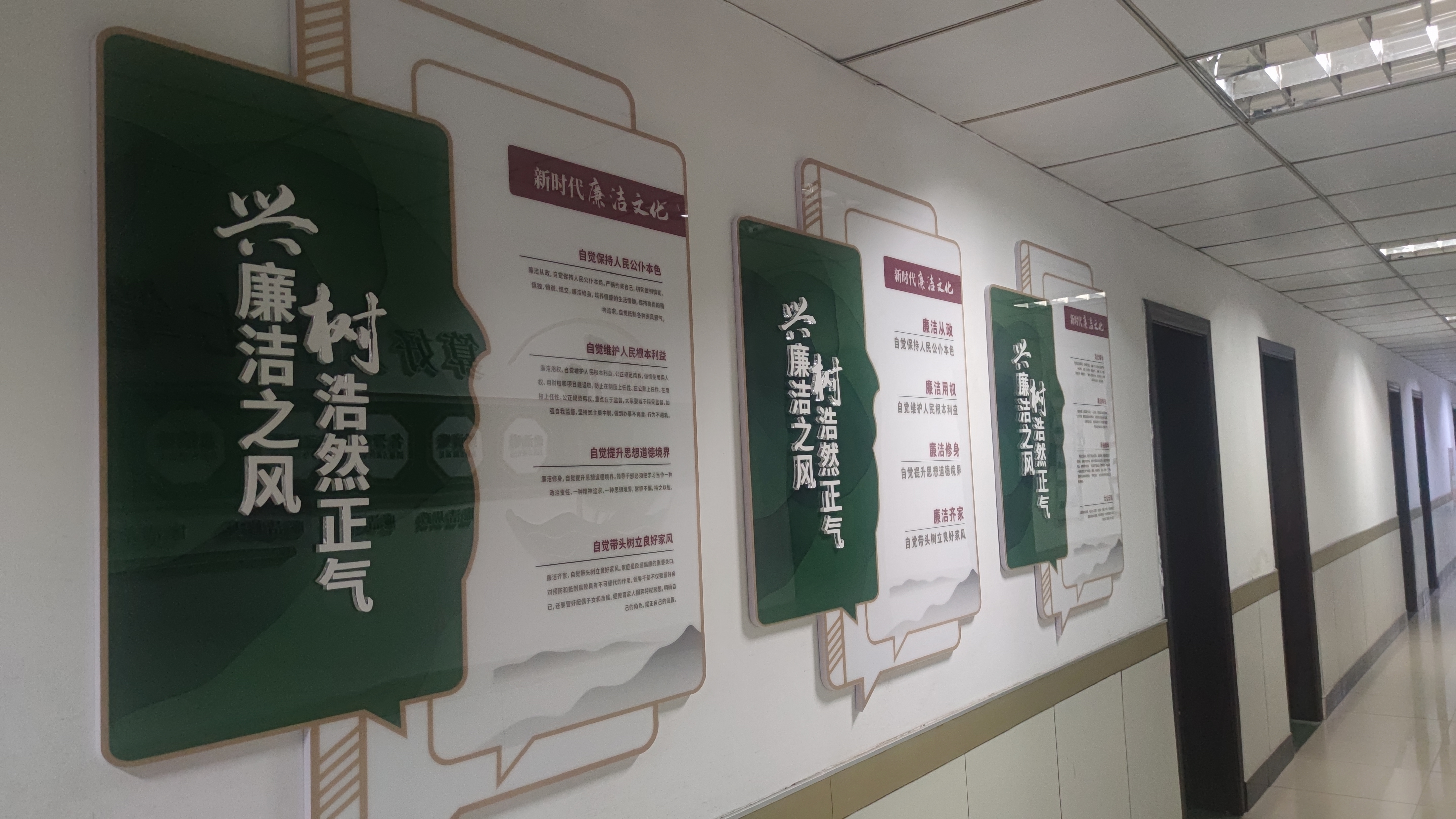 廉洁文化长廊依托大队办公区域走廊空间打造。以“廉”为核心,以“文化浸润、警示教育、价值引领”为设计理念,整体设计以绿色为主色调,搭配莲花、荷叶等象征廉洁的意象元素,与应急大队保通保畅的工作属性形成呼应。墙面上,“廉”“洁”“正”“气”等主题字样醒目突出,配以“兴廉政之风”“树浩然正气,”“中国共产党廉洁自律准则”等标语,以及廉政格言警句,构建起立体的廉洁教育体系。