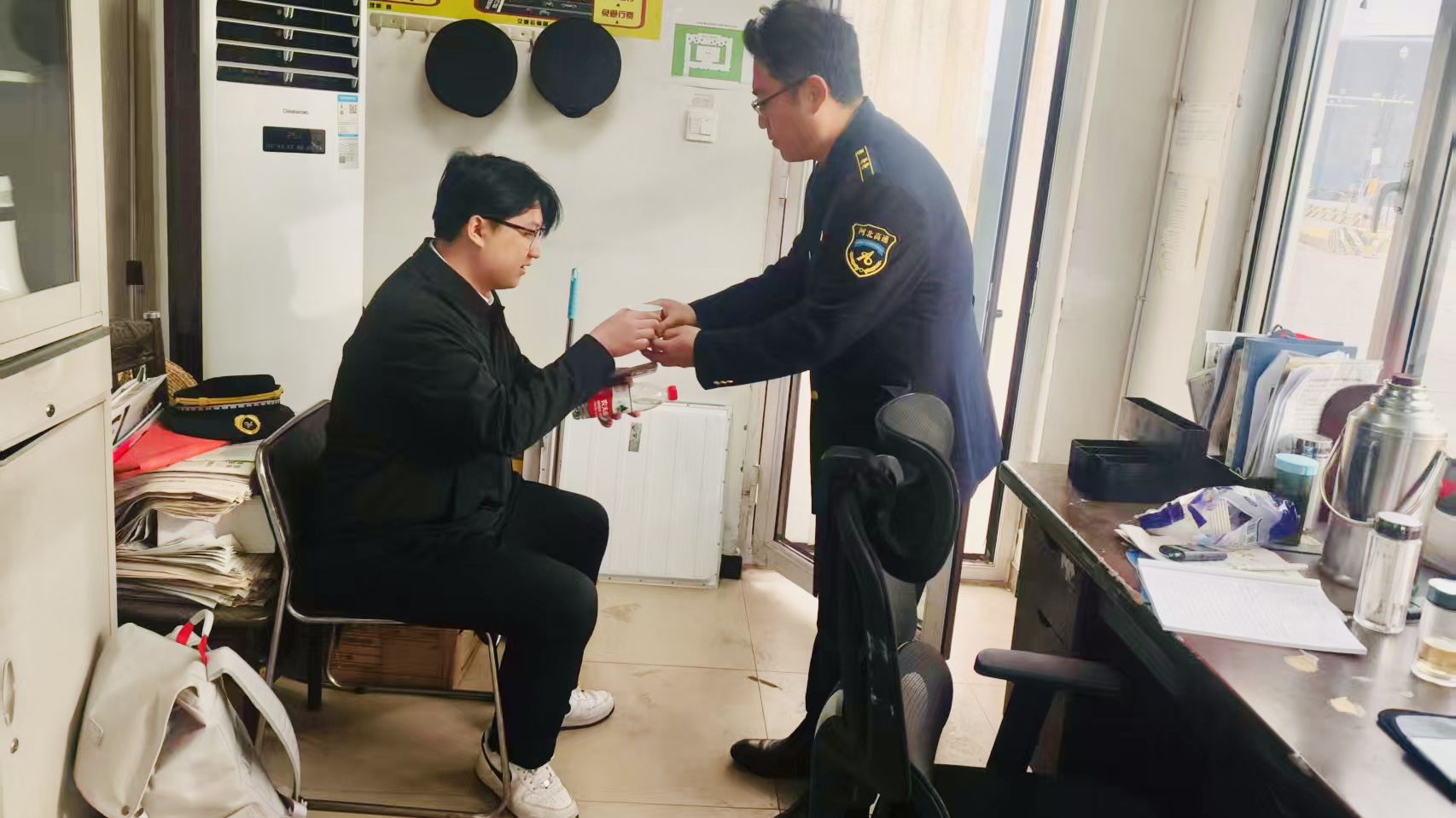 12月30日上午,天气阴沉,气温明显下降。一位司机师傅带着些许局促走进东湾收费站的便民服务亭,询问能否提供些饮用水——他车上的水已经喝完了。值班人员见状,马上起身应答,很快为他接满了一杯热水。司机接过水杯时神情舒展了不少,连连道谢,工作人员只是摆摆手,说这是应该做的。