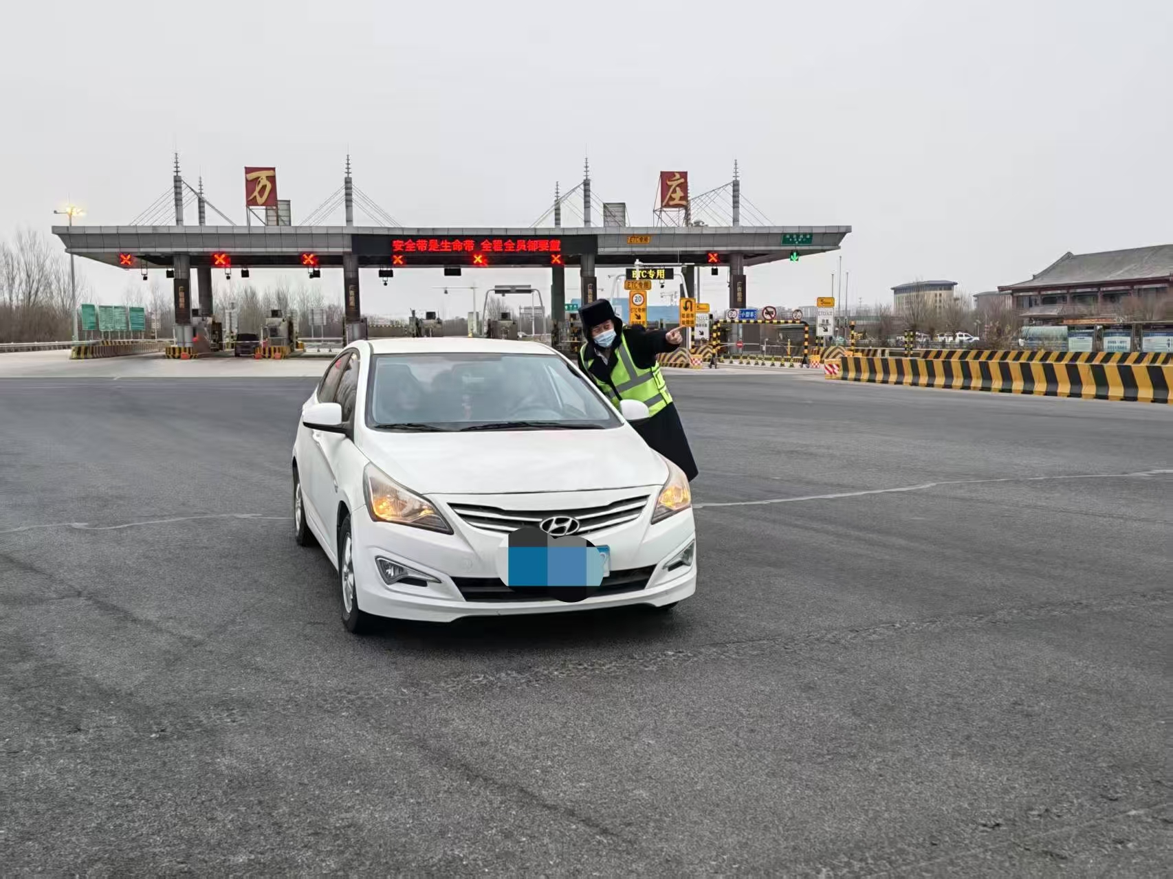 1月25日下午,一辆小轿车缴费后,缓缓前行,停在收费站外广场迟迟未动,为保障站口畅通,收费班长发现后立即上前了解情况。