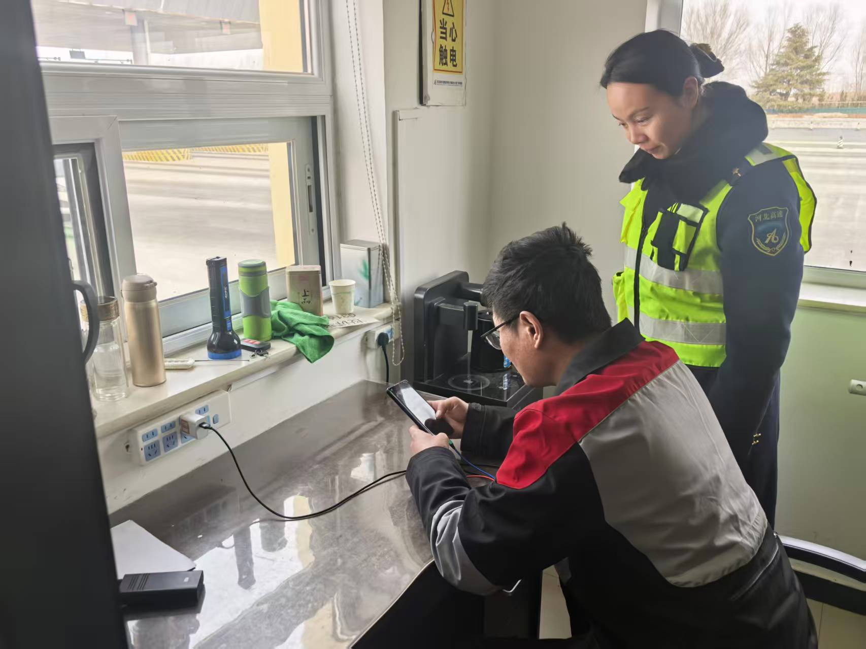 为避免造成车道拥堵,收费员一边微笑安抚司机:“师傅别着急,我们来帮您”,一边呼叫疏导员引导车辆安全停靠至外广场便民区域。随后,疏导员从便民服务亭取出手机充电器,细心帮司机连接调试,全程耐心等候。十分钟后,司机手机成功开机,顺利完成缴费。