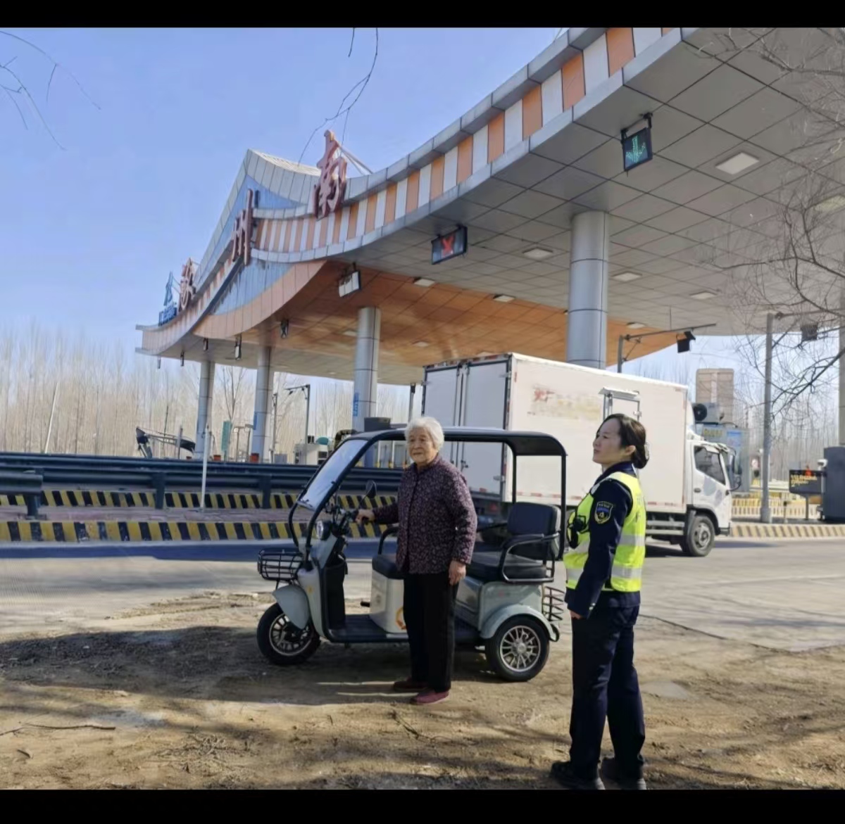 2月10日上午,在涿州南收费站广场,一位骑着电动三轮车的年迈老人在车道附近徘徊,因不熟悉路况迷失方向,神情焦急无助。当班收费人员发现这一情况后,第一时间上前将老人及车辆引导至安全区域,避免在车流中发生危险。