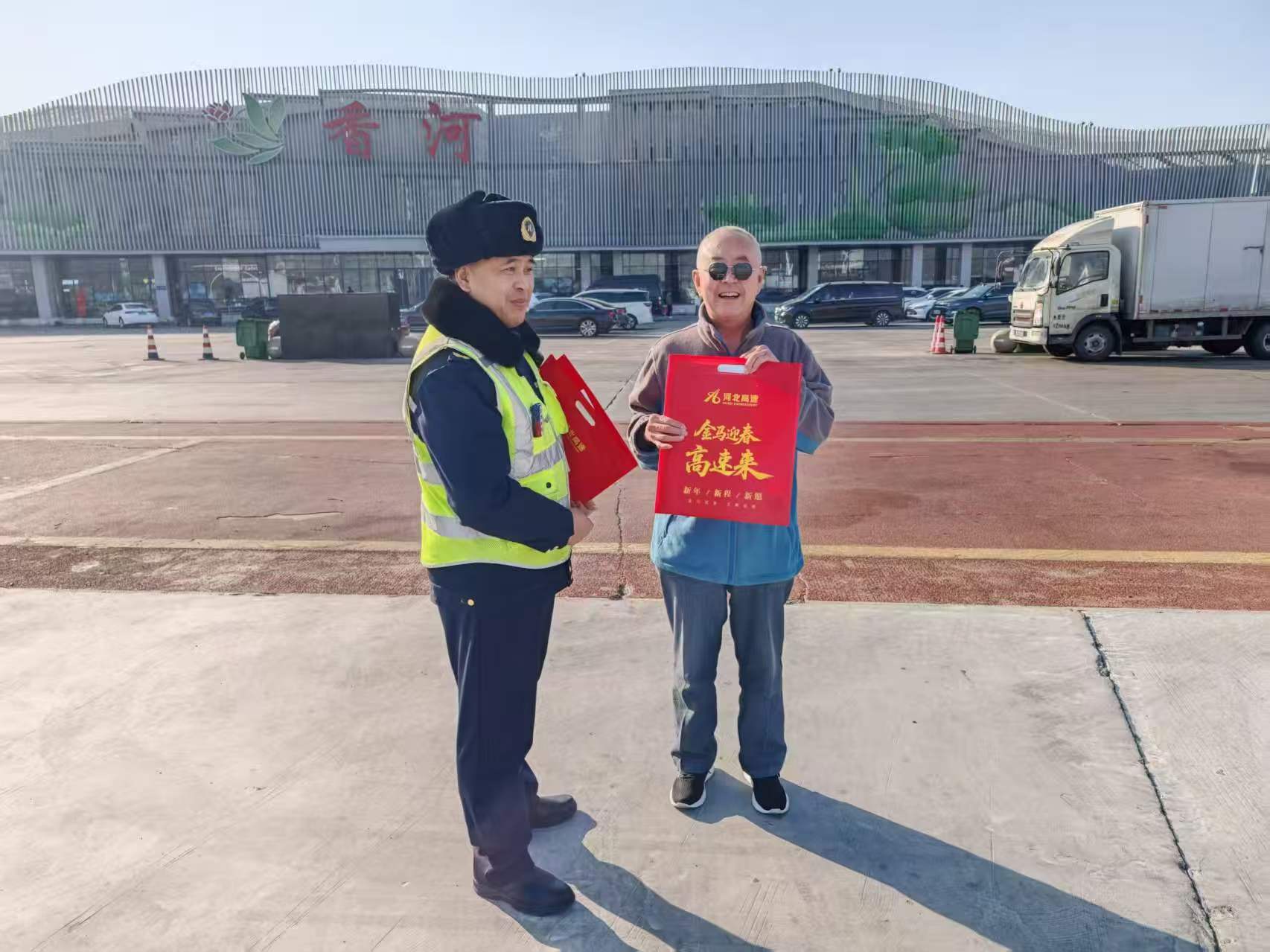 新春将至,年味渐浓,为让过往司乘在旅途之中感受浓浓新春暖意与贴心关怀,香河保通保畅应急大队专程前往香河服务区,开展新春送祝福、送礼包暖心活动,为奔波在路上的出行者送上新春问候。